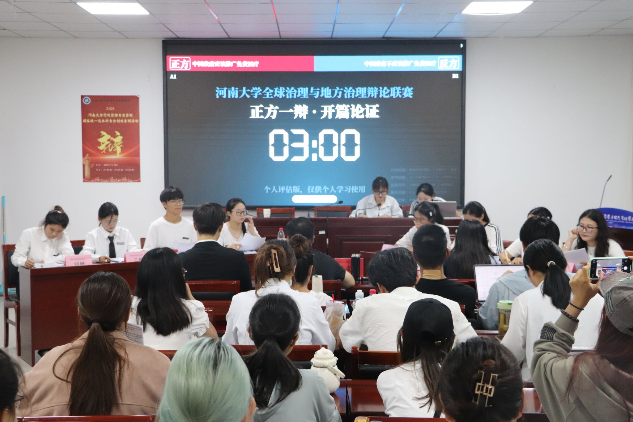 首场比赛。A1队就“中国政府是否应该推广免费医疗政策”与B1队展开激烈交锋。正方四辩王肖雨在质询环节捕捉细节,一针见血,总结陈词环节,她言简意赅地总结正方观点,重点突出,表现出色。反方辩手王海佳则从现实角度出发,在分析现有社会状况与政策的同时,提出现行医保政策的优化手段与优势,为反方论证打下坚实基础。