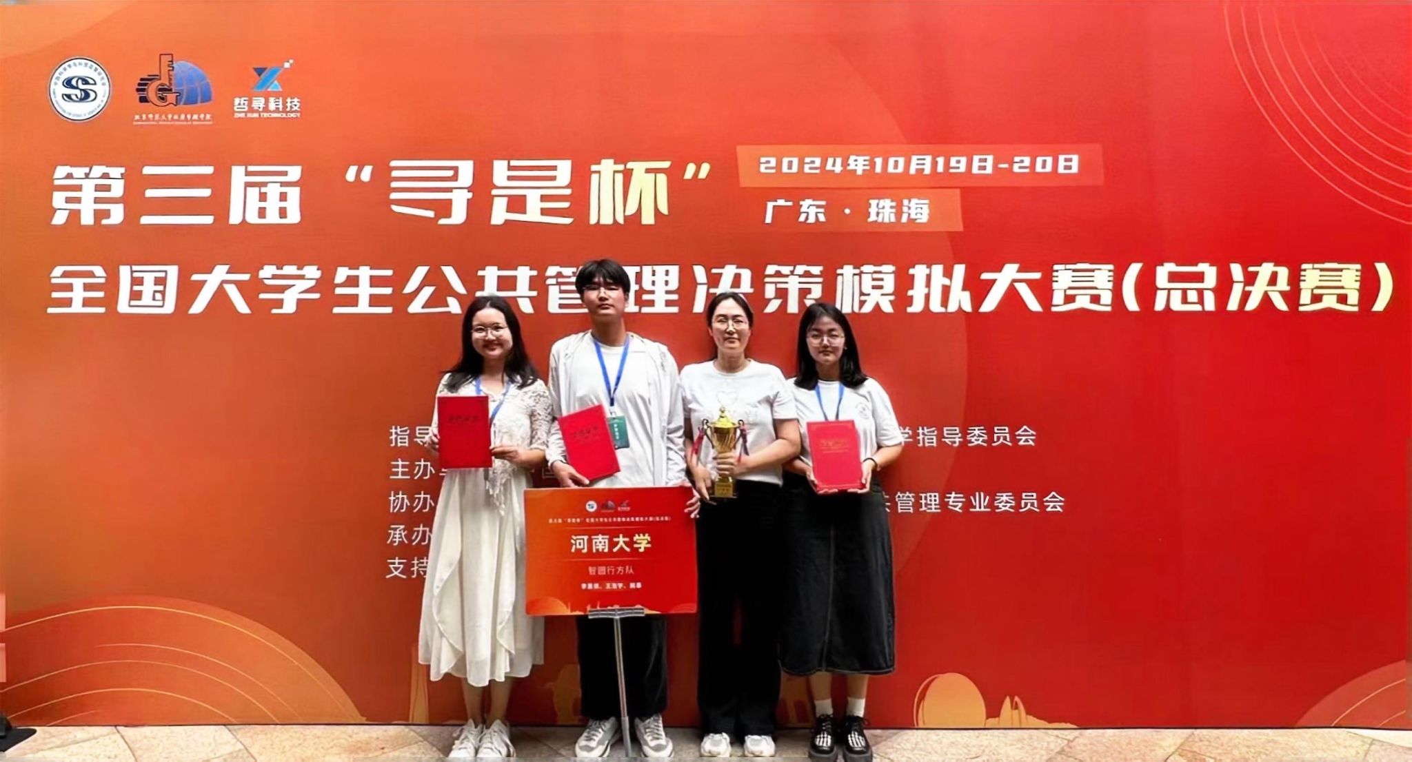 10月20日,第三届“寻是杯”全国大学生公共管理决策模拟大赛总决赛在北京师范大学珠海校区落下帷幕。麻豆在线李晓玉、元帅老师指导,2022级本科生李董祺、王浩宇、解菲三位同学组成的麻豆在线