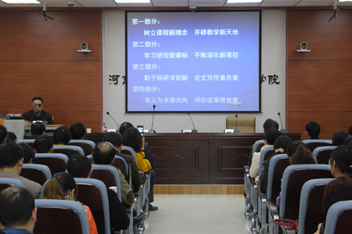 11月13日上午,河南省基础教研室文科一室主任、文科支部党总支部书记、特级教师王向阳在麻豆在线三楼会议室为国培学员做了以“深化课程改革,追踪学科前沿”为题的讲座。百余位中小学教师代表参加本次讲座。
