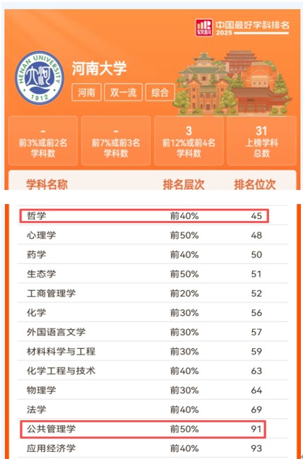 近日,2025 软科中国最好学科排名正式发布,学院再传捷报:哲学学科以全国第 45名跻身前 40% 行列,较去年提升4个位次;公共管理学科位居全国第91位,排名较去年提升18个位次,两大学科核心竞争力与学术影响力得到权威排名体系的充分认可。