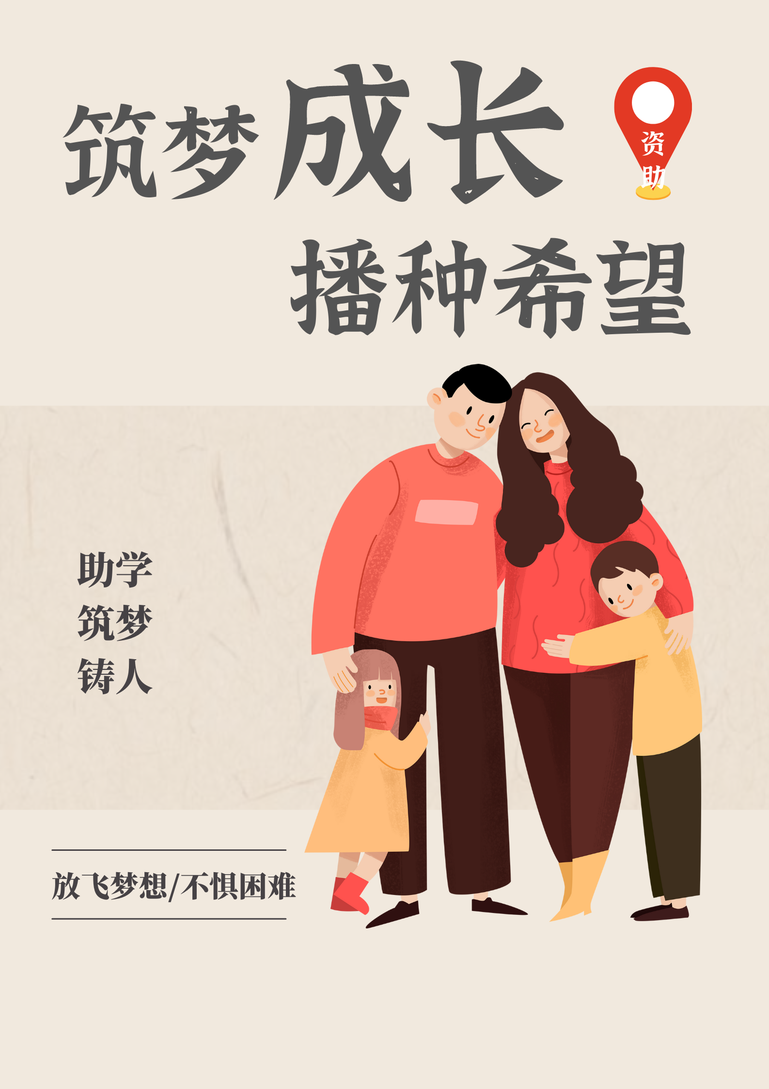 作品简介:海报以蓝天、草地、跑道为主要背景元素,象征充满青春活力的校园环境。海报中的四个青年,或在运动挥洒汗水,或在弹奏吉他,或在阅读书籍,共同闪耀青春光芒。而在校园生活多姿多彩、青春梦想纵情飞扬的背后,正是国家资助政策的支持与助力。