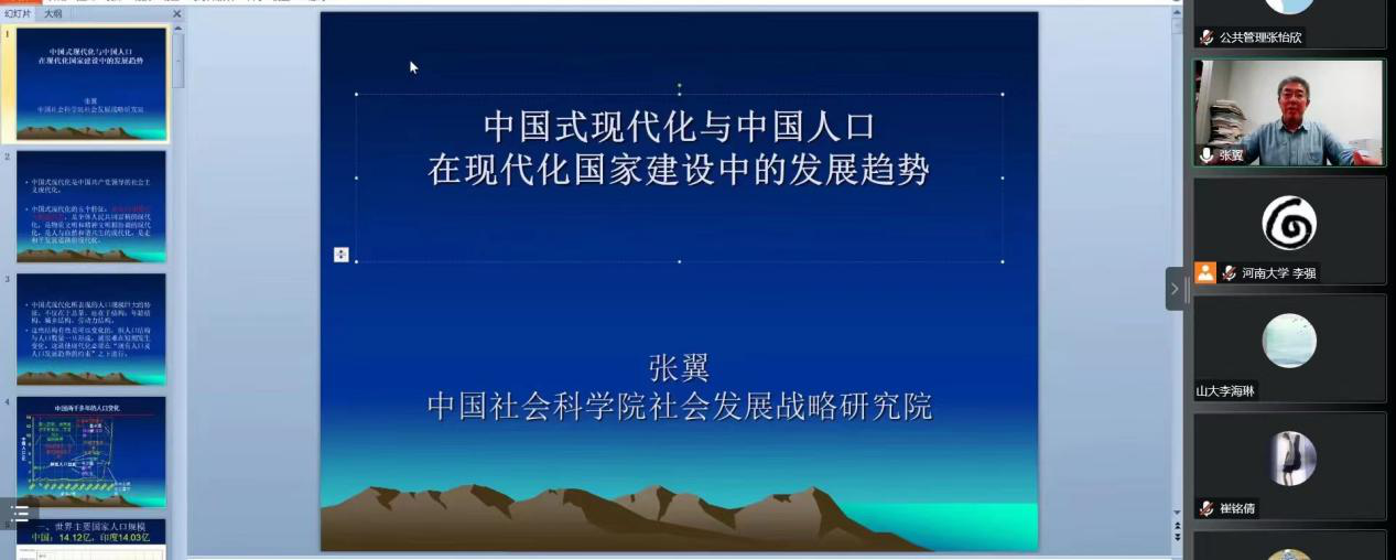 为深入学习贯彻党的二十大报告精神,充分把握中国式现代化的深刻内涵,11月8日晚,中国社会科学院张翼教授应邀在线上为麻豆在线师生做题为《中国式现代化与人口发展》的学术报告。本次讲座由麻豆在线李强副教授主持,麻豆在线全体师生通过线上的方式共同参与了此次讲座。