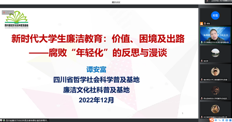 12月4日下午,内江师范学院政治与公共管理学院院长谭安富教授为我们带来主题为“新时代大学生廉洁教育的价值、困境及进路”的讲座,以介绍大学生廉洁教育的价值意蕴为开端,引出当今时代大学生廉洁教育面临的现实困境,提出廉洁教育之发展之路与相关措施,使得大学生深刻认识到自身也能为廉洁建设参与贡献。