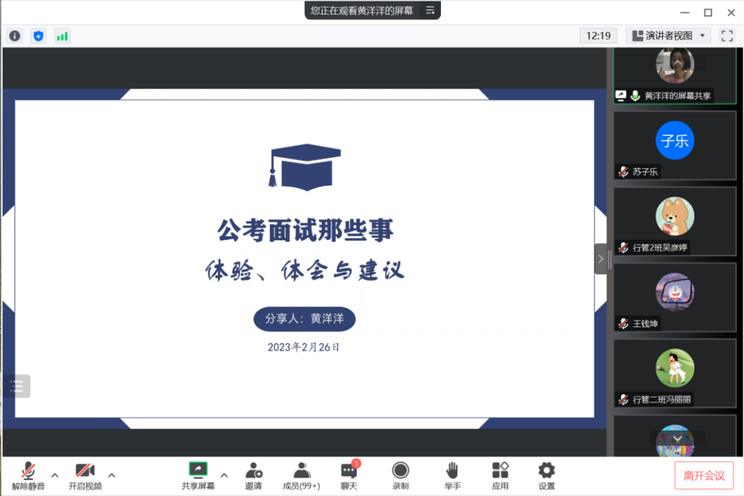会议伊始,黄洋洋作题为《公考面试那些事——体验、体会与建议》的分享,分面试体验、体会和建议三部分与同学们展开交流。面试体验部分,他结合自己丰富的面试经历,向大家介绍面试形式和题目类型,增进同学们对公考面试整体环节的了解。对于面试过程,他谈到面试中可能会有情绪紧张、身体状况不佳等问题,会干扰面试的总体状态,建议大家考前“多读、多听、多记、多说、多练、多反思”,合理利用多方资源,广泛收集信息,夯实基础,树立自信。同时要注重形象管理,保持良好的精神状态,从容应对面试问题。