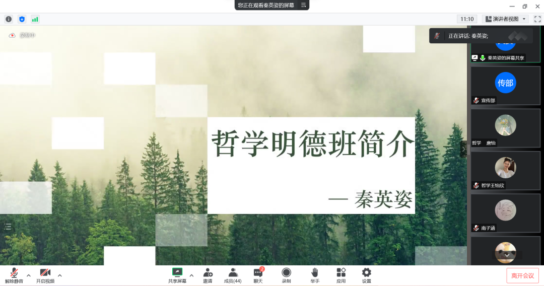哲学专业邀请2021级刘攀和秦英姿进行学习分享。刘攀认为哲学是一门独特的人文社科,他希望同学们能体会哲学的乐趣,深入思考,探寻生活意义,成就自我价值;秦英姿介绍哲学明德班的基本情况,鼓励同学们根据自身情况进行专业分流选择,在自己热爱的领域行稳致远;2022级王恰欣建议同学们提高学习主动性,减少焦虑,保持积极进取的学习态度,以自信的姿态勇敢面对学习上的困难。