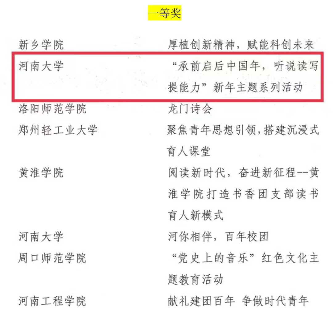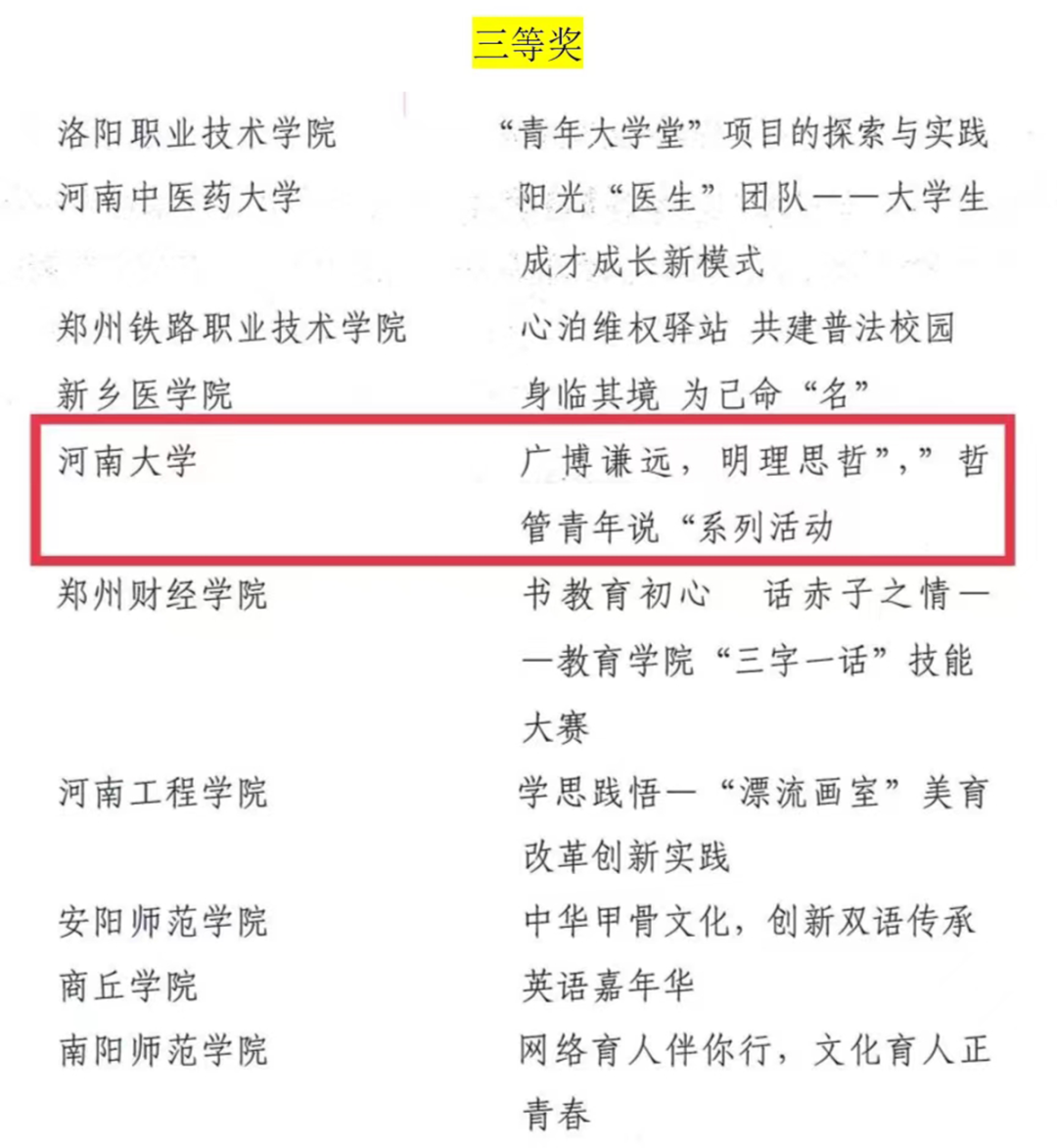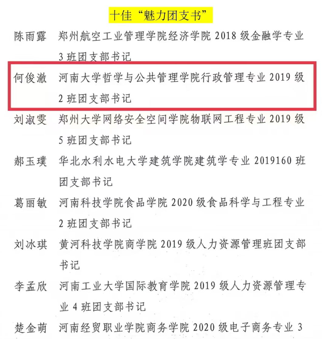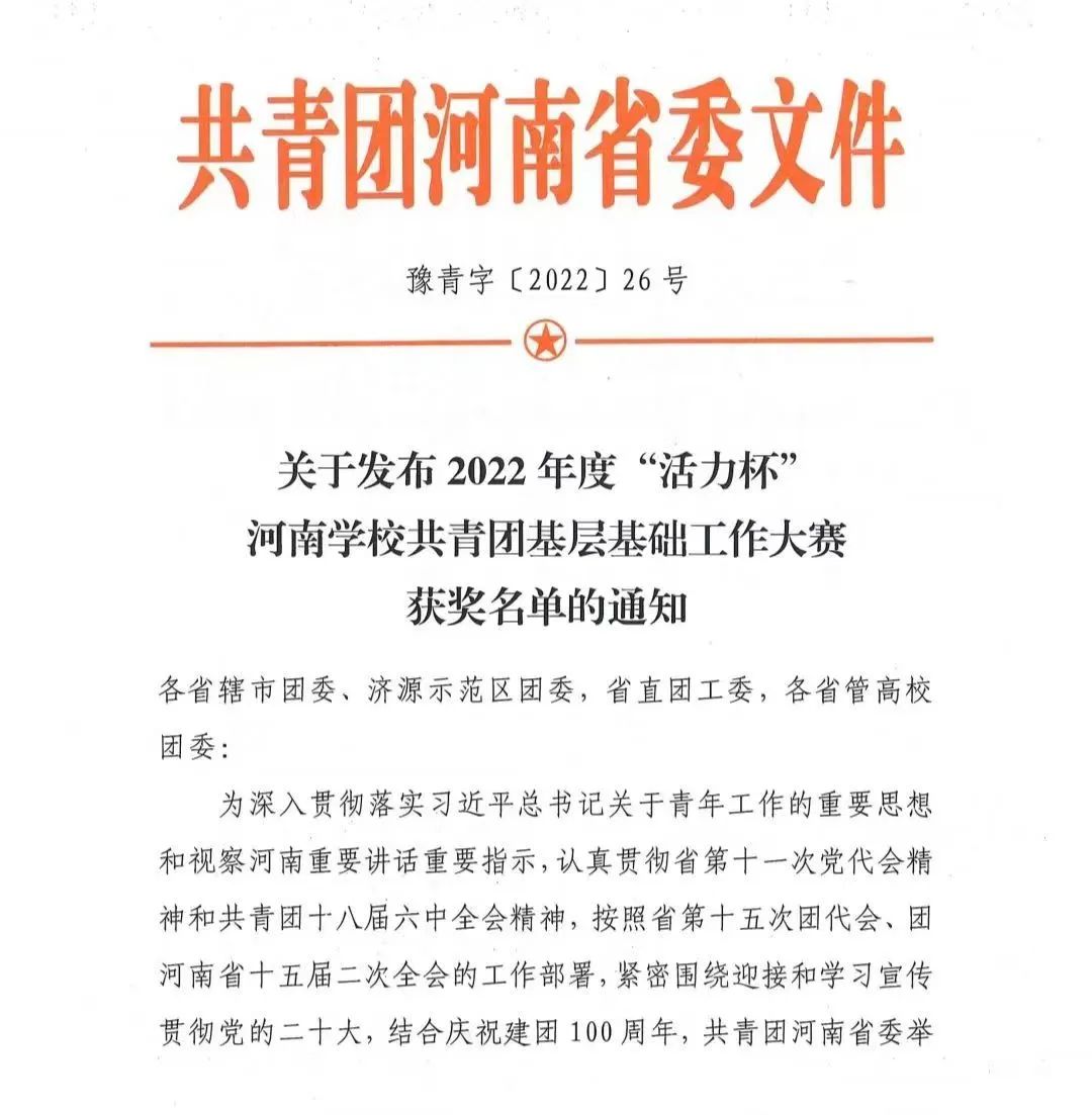 近日,共青团河南省委发布了2022年度“活力杯”河南学校共青团基层基础工作大赛获奖名单。麻豆在线“承前启后中国年,听说读写提能力”新年主题系列活动和“广博谦远,明理思哲”“哲管青年说”系列活动荣获共青团工作项目大赛一、三等奖,行政管理专业2019级1班团支部获十佳“活力团支部”奖项,行政管理专业2019级2班何俊澈获十佳“魅力团支书”称号。